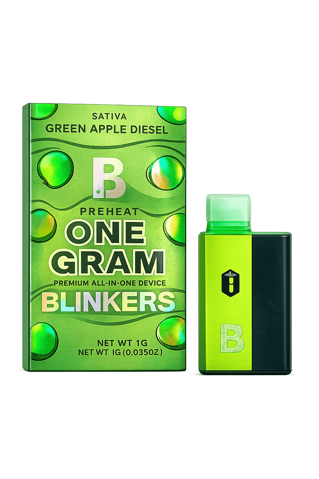 Green Apple Diesel (Sativa) – Blinkers is a vibrant cannabis vape strain known for its crisp, tart green apple flavour blended with gassy diesel undertones, delivering an energizing, uplifting high with creative, focused effects — ideal for daytime use and mood-boosting sessions.